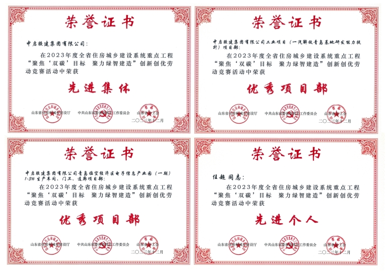 會議同期為青島市獲得2023年度全省住房城鄉(xiāng)建設(shè)系統(tǒng)重點工程“聚焦‘雙碳’目標 聚力綠智建造”創(chuàng)新創(chuàng)優(yōu)勞動競賽榮譽的先進集體、優(yōu)秀項目部和先進個人進行了頒獎。公司獲評“先進集體”榮譽稱號,公司工業(yè)項目(一汽解放青島基地研發(fā)能力提升)項目部和青島臨空經(jīng)濟區(qū)電子信息產(chǎn)業(yè)園(一期)1-3#生產(chǎn)車間、門衛(wèi)、連廊項目部被評為“優(yōu)秀項目部”,任超獲評“先進個人”。