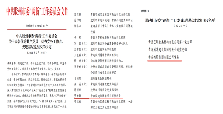 近日,市各級黨委為表彰先進、弘揚正氣,激勵廣大黨員和各級黨組織牢記囑托、勇?lián)姑?,在慶祝中國共產(chǎn)黨成立103周年之際,通報表揚了一批優(yōu)秀個人和先進集體,集團黨委喜獲多項殊榮。集團黨委書記、總裁張增昌同志榮獲青島市非公經(jīng)濟組織“黨員先鋒崗”和膠州市優(yōu)秀黨務(wù)工作者稱號;中啟膠建集團裝飾公司賈維敏同志榮獲膠州市委“兩新”工委優(yōu)秀共產(chǎn)黨員稱號;中啟控股集團黨委榮獲膠州市委“兩新”工委先進基層黨組織稱號;集團黨委所屬的中啟控股集團機關(guān)黨支部、中啟膠建集團膠州公司黨支部和中啟膠建集團青島公司黨支部獲評“2023年度膠州市五星級黨組織”稱號。