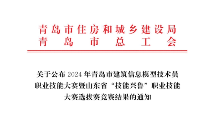 7月16日,在青島市住房和城鄉(xiāng)建設(shè)局、青島市總工會(huì)聯(lián)合主辦的2024年青島市建筑信息模型技術(shù)員職業(yè)技能大賽暨山東省“技能興魯”職業(yè)技能大賽選拔賽中,我公司市場(chǎng)經(jīng)營(yíng)部袁盛同志榮獲個(gè)人賽三等獎(jiǎng),青島公司姜培杰、楊經(jīng)光、王煒曉同志組成的參賽小組榮獲團(tuán)隊(duì)賽優(yōu)秀組織獎(jiǎng)。