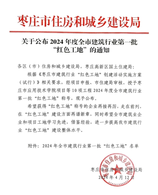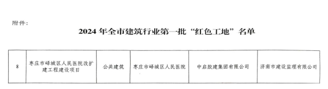 近日,棗莊市住房和城鄉(xiāng)建設(shè)局公布了2024年全市建筑行業(yè)第一批“紅色工地”名單,由公司承建的棗莊市嶧城區(qū)人民醫(yī)院改擴(kuò)建工程建設(shè)項(xiàng)目榮獲2024年度棗莊市建筑行業(yè)第一批“紅色工地”稱(chēng)號(hào)。