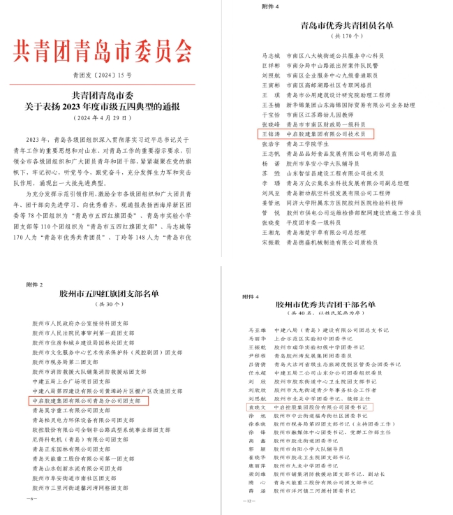 2024年是紀(jì)念五四運動105周年,也是新中國成立75周年。為傳承和弘揚“五四”精神,全面展現(xiàn)上合新區(qū)青年奮發(fā)進取的精神風(fēng)貌,膠州團市委在膠州市市民文化中心二樓舉行“奮進青春力量,建功五大新城”膠州市紀(jì)念五四運動105周年主題團日暨青春故事宣講會活動,膠州市委副書記劉濤出席并發(fā)表致辭,團市委書記孫傳奇帶領(lǐng)全體團員、團干部重溫入團誓詞,會上對全市“五四典型”進行通報表揚。中啟膠建集團有限公司青島分公司團支部榮獲2023年度“膠州市五四紅旗團支部”稱號,中啟膠建集團膠州分公司團員青年職工王銘濤榮獲“青島市優(yōu)秀共青團員”稱號,中啟控股集團股份有限公司團委書記袁曉文榮獲“膠州市優(yōu)秀共青團干部”稱號。