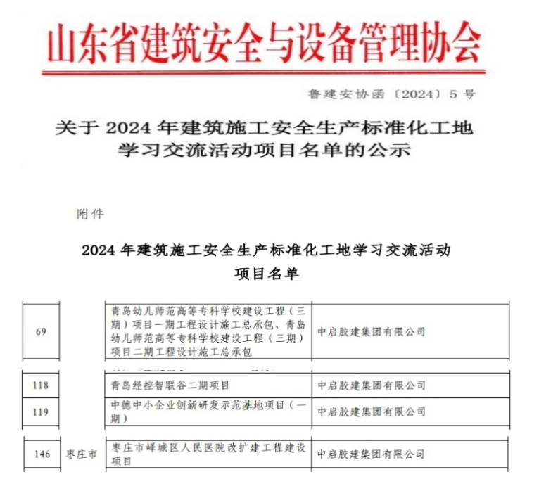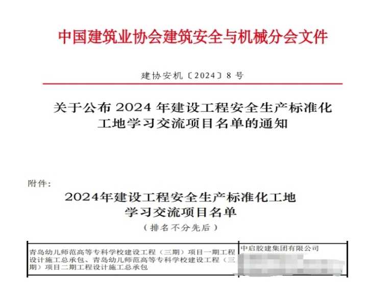 近日,中國(guó)建筑業(yè)協(xié)會(huì)建筑安全與機(jī)械分會(huì)和山東省建筑安全與設(shè)備管理協(xié)會(huì)公布了“2024年建設(shè)工程安全生產(chǎn)標(biāo)準(zhǔn)化工地學(xué)習(xí)交流項(xiàng)目”名單,公司承建的青島幼兒師范高等專(zhuān)科學(xué)校建設(shè)工程、青島經(jīng)控智聯(lián)谷二期項(xiàng)目、中德中小企業(yè)創(chuàng)新研發(fā)示范基地項(xiàng)目、棗莊市嶧城區(qū)人民醫(yī)院改擴(kuò)建工程建設(shè)項(xiàng)目獲得山東省建筑施工安全生產(chǎn)標(biāo)準(zhǔn)化工地學(xué)習(xí)交流活動(dòng)項(xiàng)目。其中,青島幼兒師范高等專(zhuān)科學(xué)校建設(shè)工程獲得全國(guó)建設(shè)工程安全生產(chǎn)標(biāo)準(zhǔn)化工地學(xué)習(xí)交流項(xiàng)目。