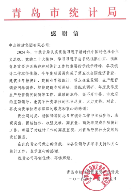 青島市統(tǒng)計(jì)局特向公司發(fā)來感謝信,對(duì)公司在統(tǒng)計(jì)工作中擔(dān)當(dāng)盡責(zé)、大力支持所做出的貢獻(xiàn)表示感謝,并對(duì)公司相關(guān)同志在日常統(tǒng)計(jì)工作中主動(dòng)參與、表現(xiàn)突出、團(tuán)結(jié)協(xié)作、攻堅(jiān)克難,高質(zhì)量、高效率完成各項(xiàng)統(tǒng)計(jì)工作提出表?yè)P(yáng)。