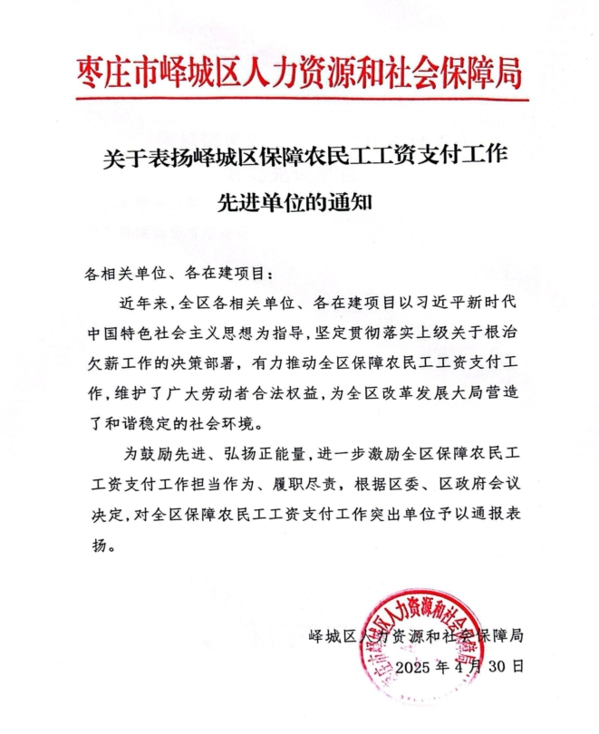 公司堅(jiān)定貫徹落實(shí)上級關(guān)于根治欠薪工作的決策部署,由華東分公司承建的棗莊市嶧城區(qū)人民醫(yī)院項(xiàng)目在保障農(nóng)民工工資支付工作中擔(dān)當(dāng)作為,履職盡責(zé)。棗莊市嶧城區(qū)人力資源和社會保障局對公司進(jìn)行了通報(bào)表揚(yáng),公司被評為嶧城區(qū)保障農(nóng)民工工資支付工作先進(jìn)單位。