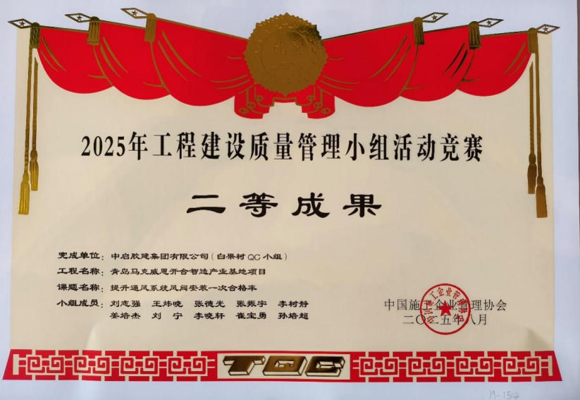 中啟膠建集團(tuán)青島公司發(fā)布的QC成果“提升通風(fēng)系統(tǒng)風(fēng)閥安裝一次合格率”榮獲中施企協(xié)2025年工程建設(shè)質(zhì)量管理小組活動(dòng)競賽二等成果。