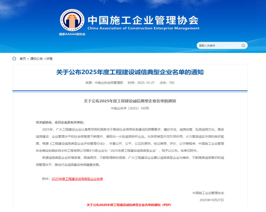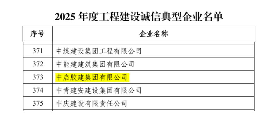近日,中國(guó)施工企業(yè)管理協(xié)會(huì)公布“2025年度工程建設(shè)誠(chéng)信典型企業(yè)”名單。中啟膠建集團(tuán)有限公司憑借長(zhǎng)期以來誠(chéng)信經(jīng)營(yíng)、合規(guī)管理及品質(zhì)服務(wù)等方面的突出表現(xiàn),成功獲評(píng)“2025年度工程建設(shè)誠(chéng)信典型企業(yè)”。獲得工程建設(shè)誠(chéng)信典型企業(yè),標(biāo)志著公司在工程建設(shè)領(lǐng)域的誠(chéng)信、專業(yè)能力和社會(huì)責(zé)任得到了行業(yè)的廣泛認(rèn)可,增強(qiáng)了公司的信譽(yù)度和公信力。對(duì)公司長(zhǎng)遠(yuǎn)發(fā)展和業(yè)務(wù)擴(kuò)展具有積極的促進(jìn)作用。